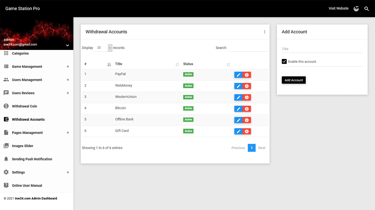 Game Station Pro (Application and Website) is a content management system that you can publish any kind of HTML5 Games. Users can play games from their smart phone or website and earn coin. With powerful and responsive admin dashboard can manage users, games, pages, sliders, push notification, unlimited categories and 4 level sub categories and publish any kind of HTML5 games.